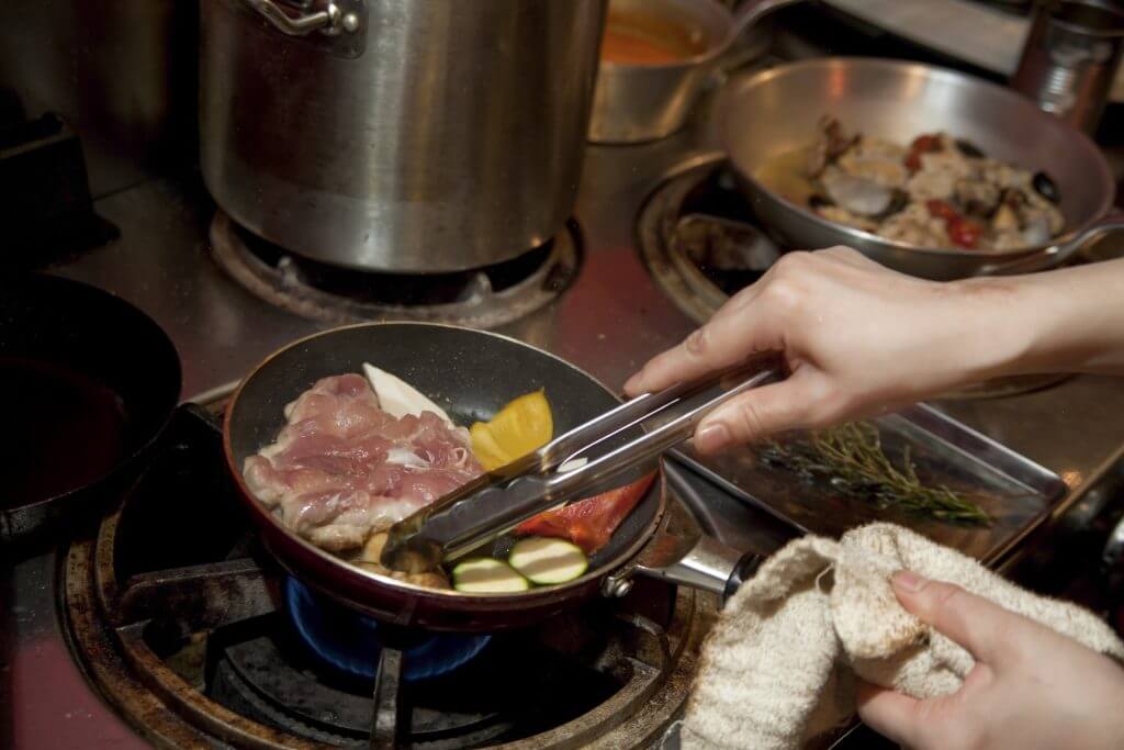 フライパンやオーブンで調理をする。かなり作業的に重い箇所ですが、技術も身につきます。
